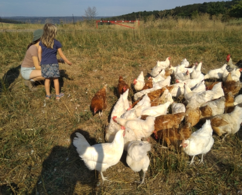 Alle 2 – 3 Monate können Sie über uns Weidehähnchen sowie einzelne Hähnchenteile vom Bioland Hof am Mühlgrund bestellen. Im Gegensatz zu ihren konventionellen Kollegen wachsen sie deutlich langsamer, haben viel mehr Platz und reichlich frische Luft. Die Tiere erhalten frisch geschrotetes Bio-Futter aus der eigenen Futtermühle. Geschlachtet wird auf dem Hof, ohne Stress durch lange Transportwege. Beste Voraussetzungen für knusprig-zartes Grill- oder Brathähnchen!